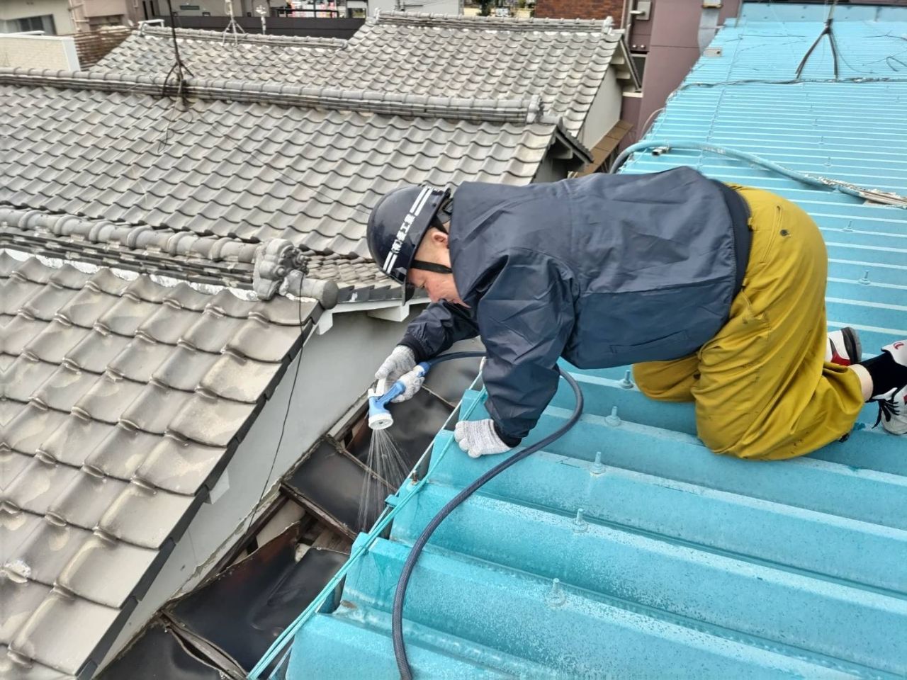 写真は散水調査の様子ですが、雨水の侵入経路と疑われる箇所にシャワーホース等で散水し、雨漏りを再現することで原因を特定する非常に重要な調査です。